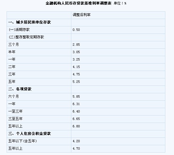 中國人民銀行4月5日宣布,自4月6日起,金融機(jī)構(gòu)一年期存貸款基準(zhǔn)利率分別上調(diào)0.25個百分點(diǎn)。其他各檔次存貸款基準(zhǔn)利率及個人住房公積金貸款利率相應(yīng)調(diào)整。其中,三年期以上貸款利率上調(diào)0.20個百分點(diǎn),幅度小于同期限存款利率。