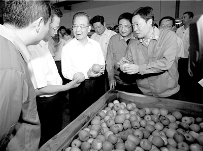 渭北高原因其獨特的自然條件盛產(chǎn)優(yōu)質(zhì)紅富士蘋果。陜西華圣果業(yè)公司是一家以蘋果產(chǎn)業(yè)為主業(yè)的高科技農(nóng)業(yè)產(chǎn)業(yè)化企業(yè)。這家企業(yè)采取“公司+基地+農(nóng)戶”的方式,先后在20多個蘋果生產(chǎn)縣建立了基地,帶動果農(nóng)10萬多戶。他們推廣使用蘋果套袋技術(shù),解決蘋果表皮粗糙、果色老化和易于污染的問題。企業(yè)擁有國內(nèi)最大、最先進的氣調(diào)保鮮庫,有一半產(chǎn)品出口國外。溫家寶考察了企業(yè)的保鮮庫和分選車間。在分選車間,一箱箱去年采摘的蘋果剛剛出庫,準備在今年蘋果收獲季節(jié)前的空當上市銷售。雖然在保鮮庫里儲藏了一年,但蘋果色澤鮮艷如新。溫家寶向企業(yè)負責(zé)人詳細詢問了蘋果出口量、價格的變化情況,考察了蘋果質(zhì)量檢測程序。溫家寶對大家說,我一邊在車間看蘋果,一邊思索國內(nèi)外的經(jīng)濟走勢。小蘋果可以看出大問題。蘋果的銷售離不開消費市場,而消費市場穩(wěn)定又離不開經(jīng)濟穩(wěn)定。從蘋果外銷市場的變化可以看出世界經(jīng)濟的變化,F(xiàn)在世界經(jīng)濟開始復(fù)蘇,但進程非常緩慢,還有很多不確定性。我們既要擴大內(nèi)需,又必須穩(wěn)定外需,兩者不可偏廢。面對世界經(jīng)濟風(fēng)云變幻,企業(yè)要有多元化的銷售渠道,多元化的品種結(jié)構(gòu),適應(yīng)不同消費群體的需要,這樣才能“東方不亮西方亮,黑了南方有北方”。