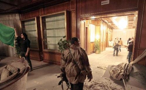 4月25日,在利比亞首都的黎波里,利比亞士兵在被轟炸的利比亞領(lǐng)導(dǎo)人卡扎菲的官邸內(nèi)查看。北約戰(zhàn)機(jī)25日凌晨對利比亞領(lǐng)導(dǎo)人卡扎菲在的黎波里的官邸實(shí)施轟炸。