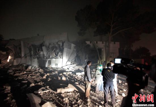4月25日,在利比亞首都的黎波里,人們站在被轟炸的利比亞領(lǐng)導(dǎo)人卡扎菲的官邸旁。北約戰(zhàn)機(jī)25日凌晨對(duì)利比亞領(lǐng)導(dǎo)人卡扎菲在的黎波里的官邸實(shí)施轟炸。利比亞政府官員譴責(zé)北約企圖殺害卡扎菲,并稱(chēng)轟炸造成45人受傷、卡扎菲辦公室受損嚴(yán)重。