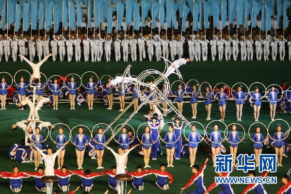 8月2日,朝鮮大型團(tuán)體操和文藝表演《阿里郎》在平壤五·一體育場舉行今年的首場公演!栋⒗锢伞酚沙r10萬名青少年和專業(yè)藝術(shù)工作者參與演出,通過刻畫朝鮮近現(xiàn)代重大歷史事件,藝術(shù)地再現(xiàn)了朝鮮民族從苦難走向幸福的歷程!栋⒗锢伞纷2002年首次公演以來,已成為朝鮮文藝表演歷史上觀看人數(shù)最多的演出。新華社記者趙展攝