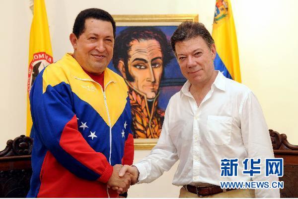 8月10日,哥倫比亞總統(tǒng)桑托斯(右)和委內瑞拉總統(tǒng)查韋斯在哥倫比亞圣瑪爾塔市舉行會談。哥倫比亞總統(tǒng)桑托斯當日在與委內瑞拉總統(tǒng)查韋斯會談后宣布兩國恢復外交關系。此前,由于哥倫比亞前總統(tǒng)阿爾瓦羅·烏里韋的政府指責委內瑞拉在其領土上庇護哥反政府武裝,委總統(tǒng)查韋斯于7月22日宣布與哥倫比亞斷交。
