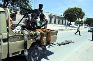 8月24日,索馬里摩加迪沙,政府軍用卡車拖著伊斯蘭武裝分子的尸體。