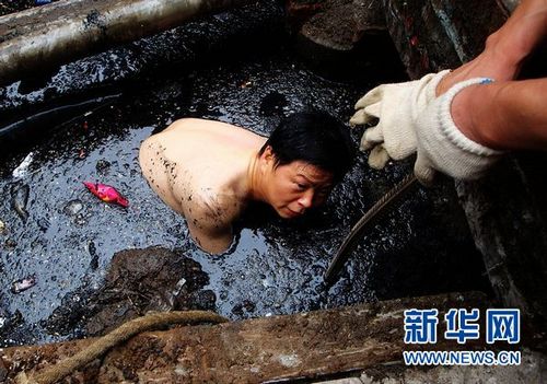 隊(duì)友拍攝的現(xiàn)場(chǎng)照片,把這個(gè)只穿一條紅色內(nèi)褲,在烏黑的臭水溝里摸索故障的傳統(tǒng)“中國(guó)男人”,演繹成了一個(gè)現(xiàn)代網(wǎng)絡(luò)紅人。