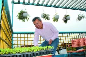牛健在位于六層樓的自家陽臺(tái)上侍弄蔬菜。