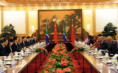胡錦濤說,中南兩國是好兄弟、好朋友、好伙伴。中方高度重視對南關(guān)系,愿同南方一道,按照深化兩國關(guān)系的新目標(biāo)、新要求,為深入發(fā)展中南全面戰(zhàn)略伙伴關(guān)系而共同努力:在政治方面,兩國領(lǐng)導(dǎo)人可通過多種方式保持密切交往,從戰(zhàn)略高度牢牢把握兩國關(guān)系發(fā)展的大方向。雙方要充分發(fā)揮中南國家雙邊委員會、戰(zhàn)略對話等合作機制的職能和作用,進(jìn)一步落實雙方已簽署的各領(lǐng)域合作文件,為中南關(guān)系發(fā)展提供機制、法律和政策保障。兩國執(zhí)政黨、立法機構(gòu)要充分利用現(xiàn)有機制和平臺加強對話交流,相互借鑒治國理政經(jīng)驗,促進(jìn)中南關(guān)系深入發(fā)展。在經(jīng)貿(mào)方面,雙方要本著互利雙贏、共同發(fā)展的原則,促進(jìn)貿(mào)易增長,加大投資力度,推進(jìn)能源合作,優(yōu)化金融服務(wù),推動兩國經(jīng)貿(mào)和經(jīng)濟技術(shù)合作又好又快發(fā)展。在人文方面,雙方要進(jìn)一步深化在文化、教育、新聞、衛(wèi)生、旅游等領(lǐng)域的合作。盡早商簽新的文化協(xié)定執(zhí)行計劃,支持兩國文藝團體、出版機構(gòu)和影視界舉辦更多交流活動。積極推進(jìn)中南在中非合作論壇框架內(nèi)的高校、科研和學(xué)術(shù)交流合作。在多邊事務(wù)方面,雙方要加強在聯(lián)合國、世貿(mào)組織、二十國集團、氣候變化“基礎(chǔ)四國”等國際機構(gòu)和框架內(nèi)的磋商與協(xié)調(diào),促進(jìn)南南合作,共同應(yīng)對全球性挑戰(zhàn),推動建立更加公正合理的國際秩序。中方贊賞南非在維護(hù)非洲和平穩(wěn)定、促進(jìn)中非合作論壇發(fā)展中發(fā)揮的重要作用,支持南非在國際事務(wù)中發(fā)揮更大作用。