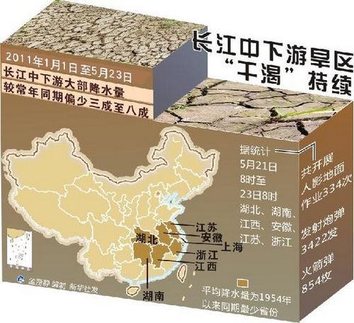 在湖北,全省一度有66個縣市的雨量為近60年來最少,受旱農(nóng)田面積達到1800萬畝,約占耕地三成,有78萬人飲水困難。最近一輪降水過后,全省重旱地區(qū)有所減少,旱情有所緩解,但仍有50個縣市降雨量為歷史同期最少,降水對中稻泡田、插秧增水作用有限。