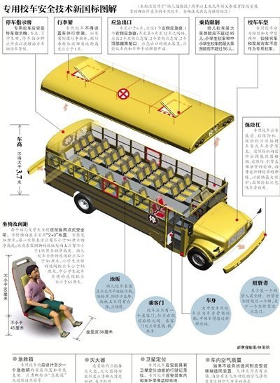 新標(biāo)準(zhǔn)增加了校車最大乘員數(shù)量限制、急救箱配備、內(nèi)裝飾件、信號系統(tǒng)、車內(nèi)空氣成分等30余項(xiàng)要求,并對學(xué)生坐椅、應(yīng)急出口、踏步等30多項(xiàng)內(nèi)容進(jìn)行了修改。