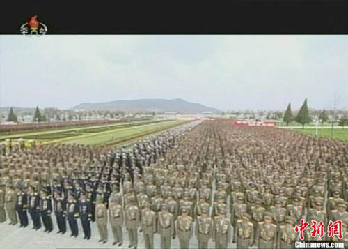 4月25日,為慶祝朝鮮人民軍建軍81周年紀(jì)念日,朝鮮在錦繡山太陽(yáng)宮殿舉行小型閱兵儀式,最高領(lǐng)導(dǎo)人金正恩當(dāng)天率領(lǐng)軍方高層出席建軍節(jié)活動(dòng)。圖為朝鮮電視臺(tái)的閱兵儀式視頻截圖。圖片來(lái)源:中新網(wǎng)