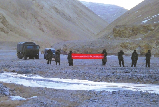 圖片說(shuō)明:印媒發(fā)布的照片顯示,中國(guó)軍人5日打出英文橫幅勸印軍后撤。