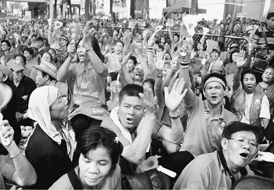 本報(bào)記者在現(xiàn)場(chǎng)看到,來(lái)自泰國(guó)全國(guó)各府的“紅衫軍”從早上陸續(xù)聚集到市中心商業(yè)區(qū)。泰國(guó)警方估計(jì),約4萬(wàn)人參加了集會(huì),警方調(diào)集了2000多名警力維持秩序。負(fù)責(zé)安全事務(wù)的泰國(guó)副總理差林表示,集會(huì)是象征性的紀(jì)念活動(dòng),不會(huì)發(fā)生暴力事件。