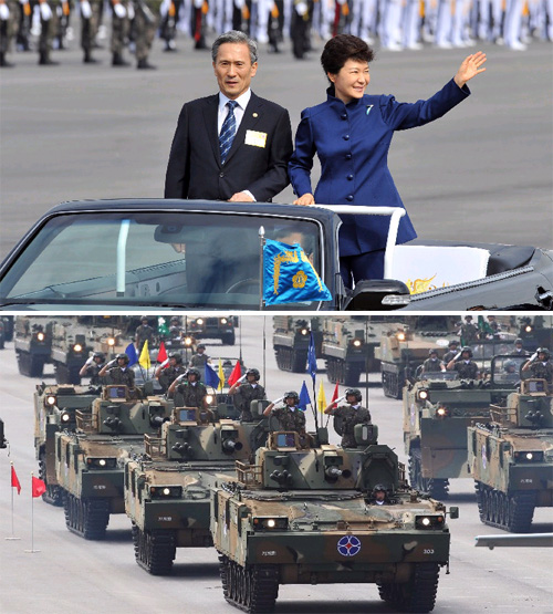 10月1日是韓國國軍日,為慶祝建軍65周年,韓國軍方當(dāng)天下午在首爾市世宗路上舉行市內(nèi)行進(jìn),接受市民檢閱。這是自2008年以來時隔5年再次舉行的街頭閱兵。當(dāng)天正式的閱兵式在京畿道城南首爾機(jī)場舉行,有1.1萬名兵力、190余輛地面裝備和120架飛機(jī)參加,創(chuàng)下了自2003年以來的最大規(guī)模。韓國總統(tǒng)樸槿惠和美國國防部部長哈格爾等出席了活動。