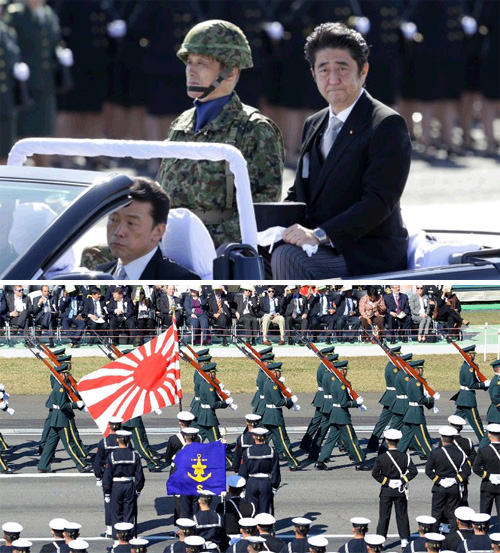 特點(diǎn):以陸上自衛(wèi)隊為主的4000人、240輛戰(zhàn)車及50架戰(zhàn)機(jī)參加閱兵式,負(fù)責(zé)離島防衛(wèi)的“西部方面普通科連隊”首次參加。10式坦克新式導(dǎo)彈——亮相。針對中國的海洋活動,安倍稱“將顯示日本不容許改變現(xiàn)狀的國家意志,為此,必須進(jìn)行警戒監(jiān)視及情報收集活動。”