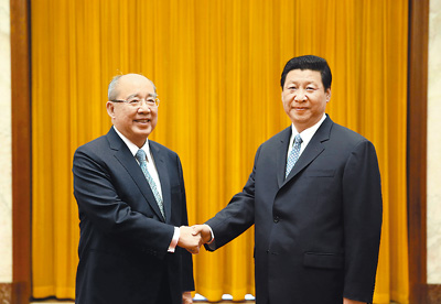 中共中央總書記習近平13日下午在人民大會堂會見了中國國民黨榮譽主席吳伯雄和他率領(lǐng)的中國國民黨訪問團全體成員。