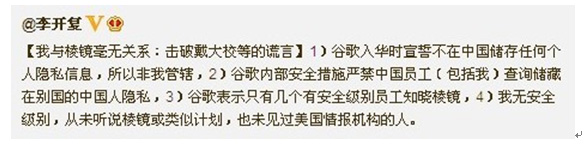 您還在自傳里說(shuō)您2000年就任微軟公司全球副總裁,成為比爾·蓋茨的七位高層智囊之一,但是我們查閱了當(dāng)時(shí)微軟向美國(guó)證監(jiān)會(huì)提交的公司年報(bào), 列了23位高管的名字,除了蓋茨、鮑莫爾,還有21位高級(jí)副總裁,就是找不到您的名字,并且微軟每年的年報(bào)都找不到李開(kāi)復(fù)這三個(gè)字。相反,您先是供職微 軟,卻讓微軟的搜索業(yè)務(wù)一敗涂地,賠得一塌糊涂,而后又出任google.cn總裁,卻再次讓google.cn賠得死去活來(lái),最后還因?yàn)橥ㄟ^(guò)搜索引擎暗 藏后門(mén)程序參與棱鏡計(jì)劃監(jiān)視和盜取中國(guó)網(wǎng)民的上網(wǎng)數(shù)據(jù)以及銀行信用卡信息,直到這一行徑被中國(guó)政府發(fā)現(xiàn)并調(diào)查后才倉(cāng)皇撤離中國(guó),并一致抵賴(lài)和狡辯,直到被 美國(guó)中情局人士斯諾登曝光之后,才昭然若揭。所以對(duì)此您應(yīng)該給出一個(gè)合理的解釋?zhuān)皇菍?duì)網(wǎng)友的這些質(zhì)疑視而不見(jiàn)。