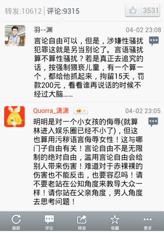 您也是一名父親,在您寫(xiě)給自己女兒的那封信中您對(duì)自己女兒的關(guān)心和呵護(hù)之情躍然紙上,我想如果有一群男人性騷擾您女兒的時(shí)候,您一定會(huì)十分憤怒 并拿起法律的武器?蛇z憾的是,在面對(duì)別人的女兒受到傷害時(shí),您竟然輕描淡寫(xiě)地在網(wǎng)上要求人家必須學(xué)會(huì)接受。為何您對(duì)待自己女兒的態(tài)度和對(duì)待別人女兒的態(tài) 度完全不一致?面對(duì)數(shù)萬(wàn)名網(wǎng)友提出的這個(gè)質(zhì)疑您一直沒(méi)有做出回答。我認(rèn)為對(duì)這件事,您應(yīng)該公開(kāi)做出解釋。否則很難不讓人聯(lián)想到去年有網(wǎng)友指出您曾經(jīng)在美國(guó) 加州的坎貝爾因涉嫌性騷擾一名叫Aimee的十三歲兒童而被起訴過(guò)這一事件究竟是真是假。面對(duì)這一網(wǎng)友爆料,您當(dāng)時(shí)解釋說(shuō)可以去查法院的公開(kāi)卷宗,肯定查 不到。但我們都知道根據(jù)美國(guó)法律,那些達(dá)成庭外和解的案子本來(lái)就沒(méi)有卷宗,所以我認(rèn)為您應(yīng)該組建一個(gè)網(wǎng)友調(diào)查團(tuán)去到坎貝爾與Aimee的父親當(dāng)面對(duì)峙,以 還原事實(shí)真相。如果是有人造謠,就依法追究造謠者的責(zé)任,如果不是造謠,那么您欠林姓小姑娘一個(gè)道歉。