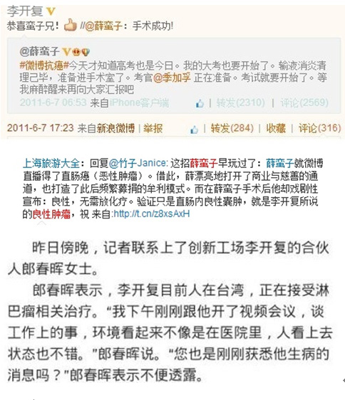 您通過(guò)微博發(fā)布消息稱(chēng)自己罹患癌癥,但是鑒于被您親切稱(chēng)呼為“老頑童”的老嫖客薛蠻子曾經(jīng)使用過(guò)“罹患癌癥”這一手段騙取民眾同情心,我們不由 得對(duì)您所自稱(chēng)的患癌表示懷疑。三年前薛蠻子曾經(jīng)通過(guò)微博宣布自己得了“直腸癌”,您也多次為其轉(zhuǎn)發(fā)祝福吶喊助威,但三年后被證實(shí)薛蠻子一直在撒謊,他從來(lái) 就沒(méi)有罹患癌癥。但他卻通過(guò)炒作自己治愈了“直腸癌”這一方式為羅氏制藥在中國(guó)大范圍出售高價(jià)直腸癌藥物安維汀。而這家公司同時(shí)還生產(chǎn)價(jià)格高得驚人的淋巴 癌藥物美羅華,而您宣布自己得的癌癥恰恰就是“淋巴癌”,宣布的時(shí)機(jī)又恰恰是薛蠻子因?yàn)榫郾娨鶃y而被刑事拘留之后,不免讓人聯(lián)想。