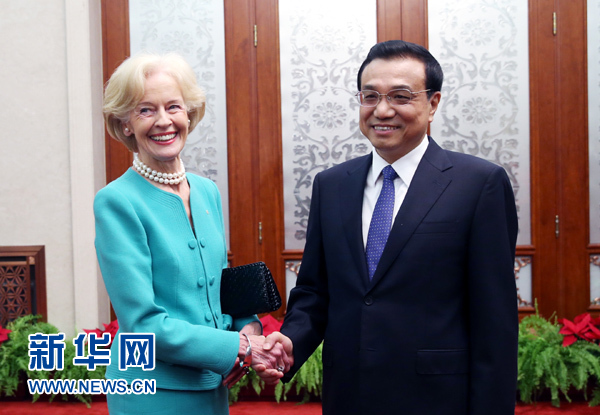 李克強說,習(xí)近平主席同你舉行了富有成果的會談。今年4月,中澳建立戰(zhàn)略伙伴關(guān)系和總理年度會晤機制,成為兩國關(guān)系新的里程碑。希望雙方尊重彼此核心利益和重大關(guān)切,加強在貿(mào)易投資、能源資源、教育人文等領(lǐng)域交流與合作,推動中澳關(guān)系在新的起點上取得更大發(fā)展。