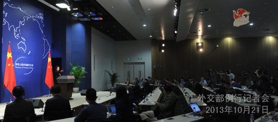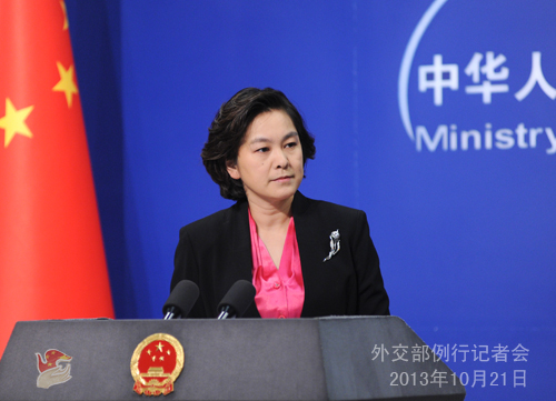 2013年10月21日,外交部發(fā)言人華春瑩主持例行記者會。