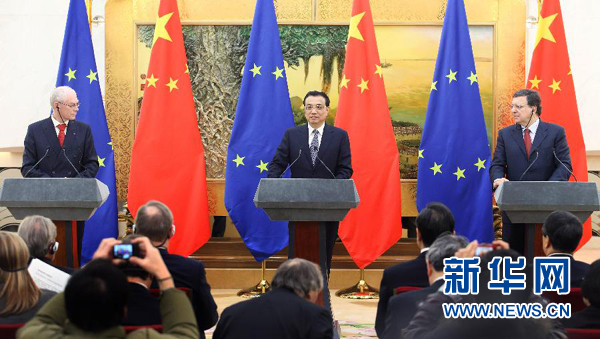 新華網(wǎng)北京11月21日電(記者譚晶晶、王慧慧)國務(wù)院總理李克強21日下午在人民大會堂與歐洲理事會主席范龍佩、歐盟委員會主席巴羅佐共同會見記者,介紹了第十六次中國歐盟領(lǐng)導(dǎo)人會晤成果:一是發(fā)表《中歐合作2020戰(zhàn)略規(guī)劃》,這份規(guī)劃涵蓋面之廣前所未有,可以說是“上天下海入地”。二是正式宣布啟動中歐投資協(xié)定談判。三是積極探討開展自貿(mào)區(qū)可行性研究,力爭到2020年貿(mào)易額達到一萬億美元。四是密切人文交流,加緊商談便利人員往來協(xié)議,加強公共政策對話。五是加強在國際和地區(qū)事務(wù)中的溝通與協(xié)調(diào)。