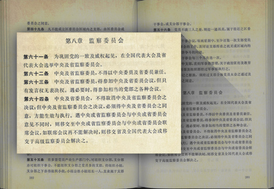 新修訂的黨章中專門增設(shè)了“黨的監(jiān)察委員會(huì)”一章,對中央和省監(jiān)察委員會(huì)產(chǎn)生的方式、職責(zé)權(quán)限范圍以及工作運(yùn)行機(jī)制都作了詳細(xì)的規(guī)定。黨章規(guī)定:“為鞏固黨的一致及權(quán)威起見,在全國代表大會(huì)及省代表大會(huì)選舉中央及省監(jiān)察委員會(huì)”,黨的全國代表大會(huì)還負(fù)責(zé)討論和批準(zhǔn)中央監(jiān)察委員會(huì)的報(bào)告、人數(shù)、改選等工作,“中央及省監(jiān)察委員,不得以中央委員及省委員兼任”。
