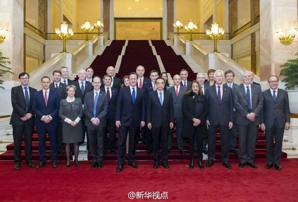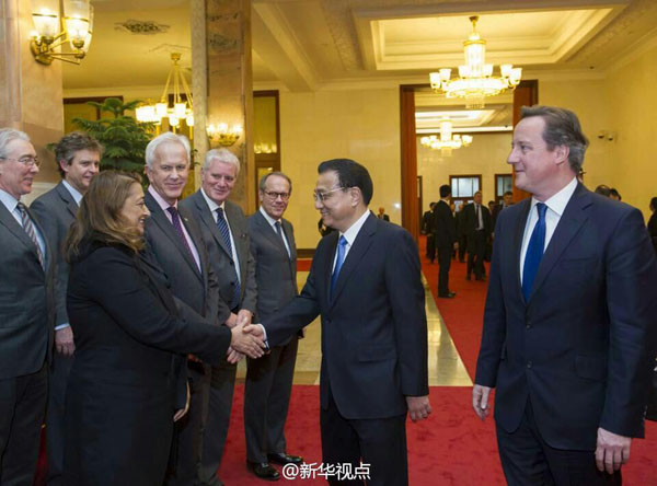 新華網北京12月2日電(記者廖雷)國務院總理李克強2日與英國首相卡梅倫舉行會談后,共同會見了隨同卡梅倫首相訪華的英國企業(yè)家代表。