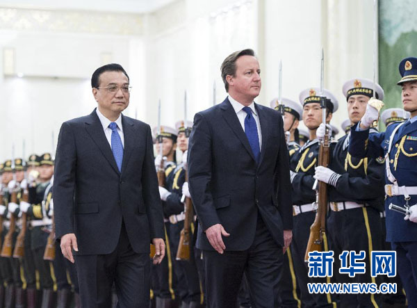 12月2日,中國(guó)國(guó)務(wù)院總理李克強(qiáng)在北京人民大會(huì)堂北大廳舉行歡迎儀式,歡迎來(lái)華進(jìn)行正式訪問(wèn)并出席中英總理年度會(huì)晤的英國(guó)首相卡梅倫。新華社記者 王曄 攝