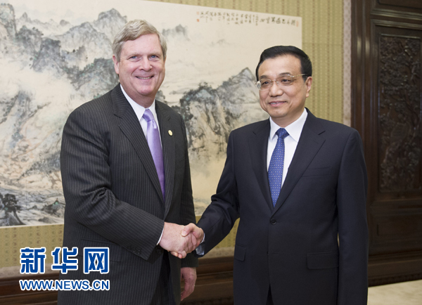 這是李克強與美國農(nóng)業(yè)部長維爾薩克握手。新華社記者 謝環(huán)馳 攝