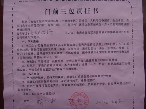 6月7日,白澤湖鄉(xiāng)大楓社區(qū),進(jìn)一步統(tǒng)一思想,提高認(rèn)識(shí),以安慶“門前三包”工作推進(jìn)會(huì)為契機(jī),立足實(shí)際,對(duì)管轄范圍內(nèi)沿街商戶和小區(qū)經(jīng)營(yíng)戶簽訂“門前三包”責(zé)任書,簽訂率達(dá)100%,著力打造一個(gè)衛(wèi)生清潔、環(huán)境秀美、文明和諧的美麗大楓社區(qū)。