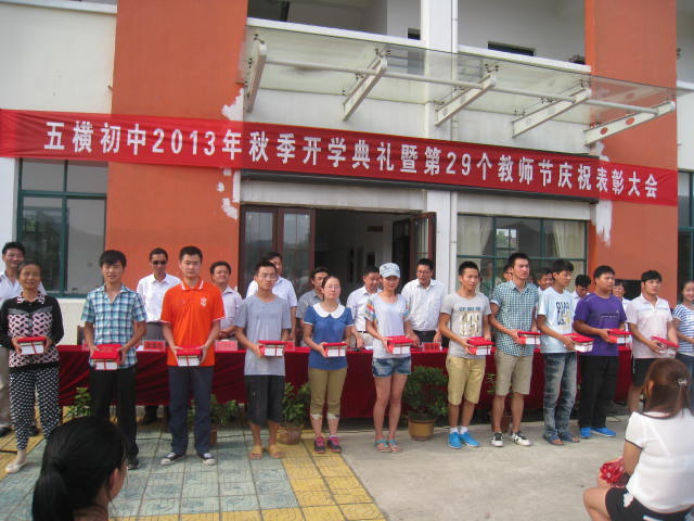 金鳳送爽,丹桂飄香 。2013年9月2日下午,五橫初中在校園科技廣場舉行了2013秋季開學(xué)典禮暨第29個(gè)教師節(jié)慶祝表彰大會(huì)。宜秀區(qū)教育局陳場送副局長、五橫鄉(xiāng)黨政領(lǐng)導(dǎo)、村、中心校領(lǐng)導(dǎo)、完小領(lǐng)導(dǎo)、部分優(yōu)秀高考學(xué)子及家長、五橫初中全體師生參加了會(huì)議。會(huì)上為三好學(xué)生、優(yōu)秀學(xué)生干部及成績優(yōu)勝者頒獎(jiǎng),同時(shí)五橫鄉(xiāng)政府也首次為今年五橫鄉(xiāng)籍高考22名優(yōu)秀學(xué)子頒發(fā)了榮譽(yù)證書、獎(jiǎng)品和獎(jiǎng)金。