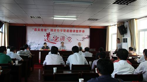 啟動(dòng)儀式上,區(qū)政協(xié)主席劉華、區(qū)委常委、宣傳部長(zhǎng)朱學(xué)云共同為楊橋鎮(zhèn)道德講堂揭牌。講堂內(nèi)先后播放了黃梅小戲“最美爸爸”和楊橋鎮(zhèn)文明創(chuàng)建宣傳片,其中“最美爸爸”一片真實(shí)再現(xiàn)了市愛(ài)心企業(yè)家—魯世鋼背著殘疾學(xué)生汪輝參加高考、到醫(yī)院進(jìn)行治病,并背其到大學(xué)報(bào)到的愛(ài)心事跡,大家全神貫注地觀看著影片,很多學(xué)員深受感動(dòng),甚至情不自禁地流下熱淚。