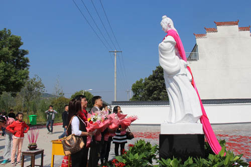 10月5日,宜秀區(qū)羅嶺鎮(zhèn)嚴(yán)鳳英故居前的廣場(chǎng)上,鮮花綻放、游人如織。這里正在舉行嚴(yán)鳳英雕塑落成儀式。上午8點(diǎn)58分,區(qū)委常委、宣傳部長(zhǎng)朱學(xué)云和羅嶺鎮(zhèn)黨委書記王朝東共同為嚴(yán)鳳英雕塑揭幕。在震耳欲聾的鞭炮聲中,一代黃梅戲大師嚴(yán)鳳英的雕像徐徐展現(xiàn)在人們面前。當(dāng)?shù)氐娜罕娮园l(fā)給嚴(yán)鳳英的雕像披上彩綢,許多外地慕名而來的嚴(yán)鳳英的粉絲們還向雕像敬獻(xiàn)了鮮花。