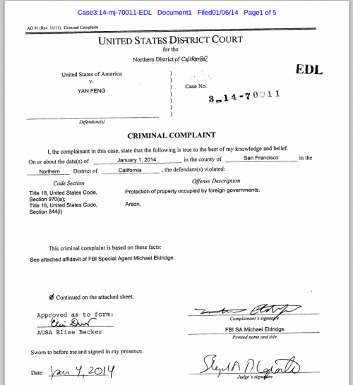 馮巖縱火燒毀中國駐舊金山總領(lǐng)館正門的法庭文件。(資料圖)
