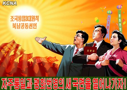 宣傳畫《堅(jiān)決站在“由我們民族自己”的立場(chǎng),尊重并誠(chéng)實(shí)地履行共同宣言!》、《排斥外來(lái)勢(shì)力,堅(jiān)持“由我們民族自己”的立場(chǎng)!》,表達(dá)了朝鮮全民族在統(tǒng)一三項(xiàng)原則和《北南共同宣言》的旗幟下,必定實(shí)現(xiàn)朝鮮半島統(tǒng)一的信念。