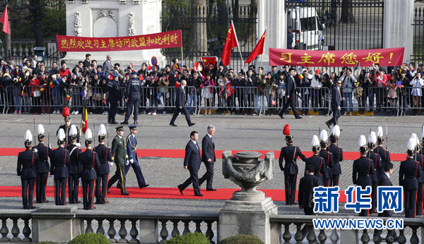 3月30日,中國國家主席習(xí)近平在布魯塞爾會(huì)見比利時(shí)國王菲利普。會(huì)見前,習(xí)近平出席菲利普國王在王宮廣場舉行的隆重歡迎儀式。新華社記者 鞠鵬 攝