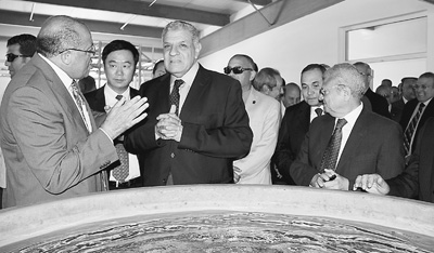 埃及臨時政府總理馬赫萊卜(左三)在中國援建的蘇伊士運河大學漁業(yè)與水產(chǎn)教學培訓(xùn)中心視察時,聽取情況介紹。 |