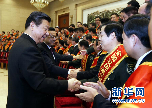 1月24日,2014年軍民迎新春茶話會在京舉行。會前,黨和國家領(lǐng)導(dǎo)人習(xí)近平、李克強(qiáng)、劉云山、張高麗等親切會見全國雙擁模范代表。新華社記者 鞠鵬 攝