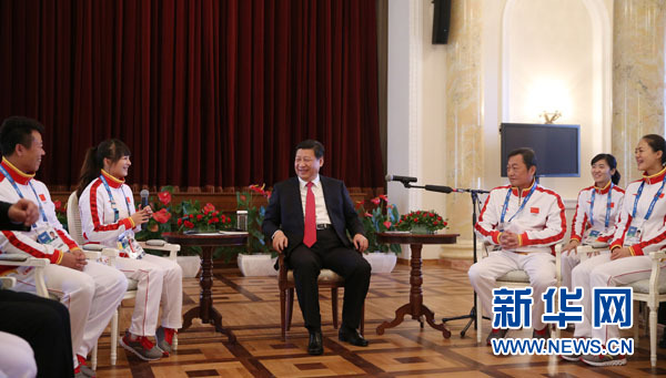 11時40分,距索契冬奧會開幕式還有不到9小時,習(xí)近平走進(jìn)會見大廳,向在場的50多名中國體育代表團(tuán)成員揮手致意,并同他們一一握手。場內(nèi)氣氛頓時活躍起來。運(yùn)動員、教練員和工作人員立即圍坐在習(xí)近平兩旁。