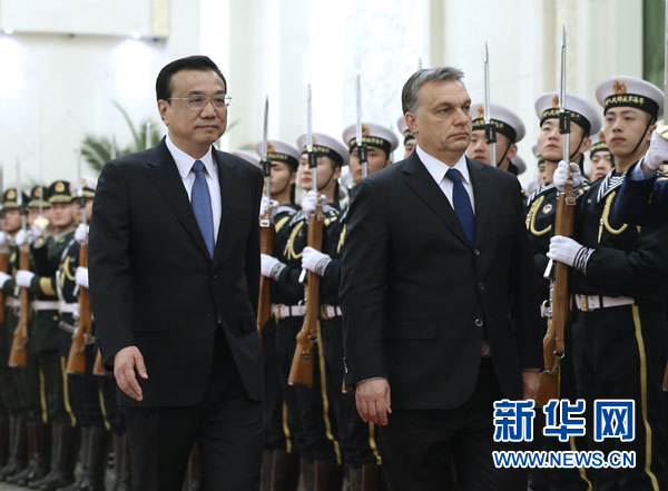 2月12日,國(guó)務(wù)院總理李克強(qiáng)在北京人民大會(huì)堂同匈牙利總理歐爾班舉行會(huì)談。這是會(huì)談前,李克強(qiáng)在人民大會(huì)堂北大廳舉行儀式歡迎歐爾班。新華社記者 謝環(huán)馳 攝