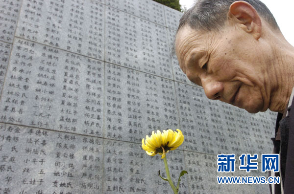 2006年4月5日,74歲的南京大屠殺幸存者佘子清手捧鮮花,祭奠被日軍殺害的母親。2月25日下午,十二屆全國人大常委會第七次會議審議全國人大常委會關(guān)于設(shè)立南京大屠殺死難者國家公祭日的決定草案。決定草案將12月13日設(shè)立為南京大屠殺死難者國家公祭日。新華社記者 孫參 攝
