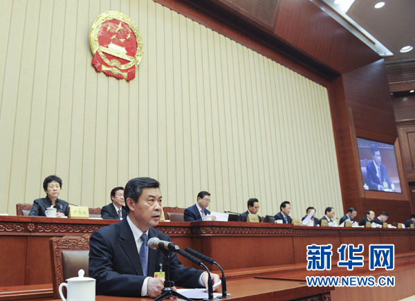 這是全國人大常委會法制工作委員會主任李適時受委員長會議委托作全國人大常委會關(guān)于確定中國人民抗日戰(zhàn)爭勝利紀(jì)念日的決定草案的說明和全國人大常委會關(guān)于設(shè)立南京大屠殺死難者國家公祭日的決定草案的說明。新華社記者 王曄 攝