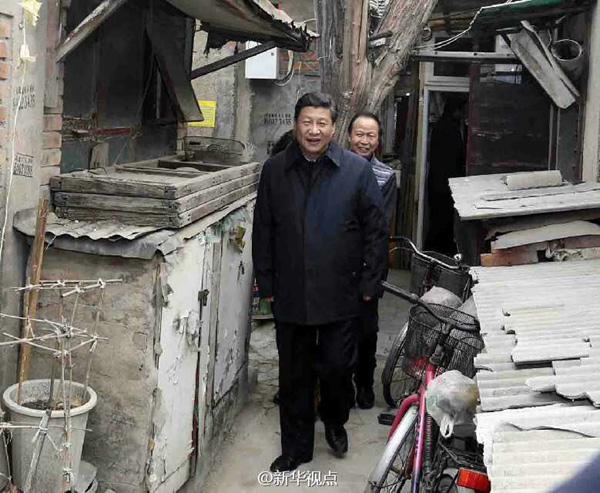 新華網(wǎng)北京2月25日電 據(jù)新華社“新華視點”微博報道,雨兒胡同29號、30號是北京典型的大雜院,院里都是小平房,過道狹窄。“做飯燒什么?”“取暖方便不方便?”“胡同里幾個廁所?”總書記走進王云鳳等4戶人家,問冷暖,聽心愿。在北京老城區(qū)長大的習近平說,這一片胡同我很熟悉,今天來看看老街坊,了解大家實際生活情況。