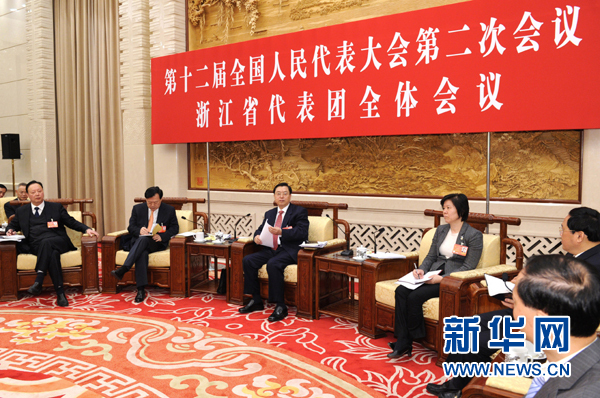 3月5日,中共中央政治局常委、全國人大常委會(huì)委員長張德江參加十二屆全國人大二次會(huì)議浙江代表團(tuán)的審議。 新華社記者饒愛民攝
