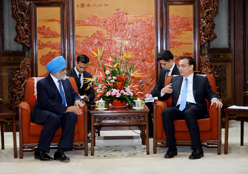 國務(wù)院總理李克強19日下午在中南海紫光閣會見來華出席第三次中印戰(zhàn)略經(jīng)濟對話的印方主席阿魯瓦利亞。 李克強表示,中印互為重要鄰國,雙邊關(guān)系發(fā)展勢頭良好。今年是“中印友好交流年”,中方愿與印方共同努力,鞏固政治互信,擴大全方位合作,將中印戰(zhàn)略合作伙伴關(guān)系推上新水平。 李克強指出,當(dāng)前中印都面臨加快經(jīng)濟轉(zhuǎn)型、將發(fā)展經(jīng)濟、改善民生同節(jié)能環(huán)保、促進可持續(xù)發(fā)展相結(jié)合的共同任務(wù)。希望雙方發(fā)揮好兩國25億人口的獨特巨大優(yōu)勢,抓住發(fā)展機遇,深化城鎮(zhèn)化、信息通信、高技術(shù)等領(lǐng)域合作,將中國高鐵、能源等裝備制造的技術(shù)和成本優(yōu)勢同印度市場需要緊密結(jié)合,攜手推進孟中印緬經(jīng)濟走廊建設(shè),促進區(qū)域互聯(lián)互通和一體化。 阿魯瓦利亞表示,去年兩國總理實現(xiàn)互訪,極大促進了雙邊關(guān)系發(fā)展。當(dāng)前印中合作面臨難得機遇,印方愿與中方一道,辦好“印中友好交流年”慶;顒樱訌姰a(chǎn)業(yè)園區(qū)、鐵路、能源、城鎮(zhèn)化等合作,推動印中關(guān)系發(fā)展取得新成果。印方歡迎更多中國企業(yè)赴印投資,將為此提供便利。 |