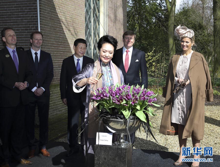 3月23日,中國國家主席習(xí)近平和夫人彭麗媛在荷蘭國王威廉-亞歷山大和馬克西瑪王后陪同下參觀中荷農(nóng)業(yè)合作和荷蘭郁金香花展。彭麗媛應(yīng)邀將新培育的郁金香命名為“國泰”,并按當(dāng)?shù)貍鹘y(tǒng)澆上香檳。資料圖
