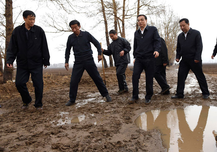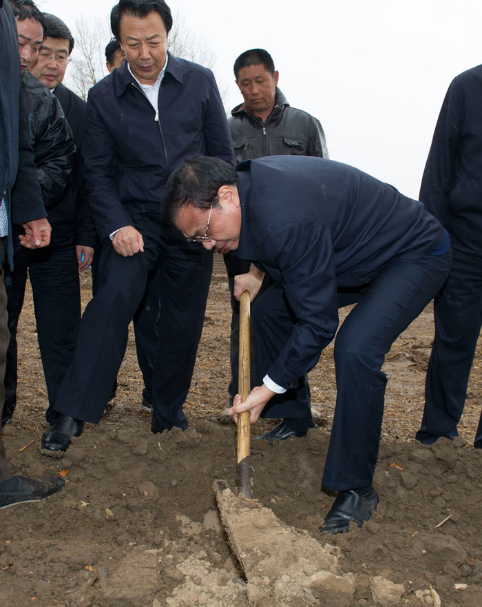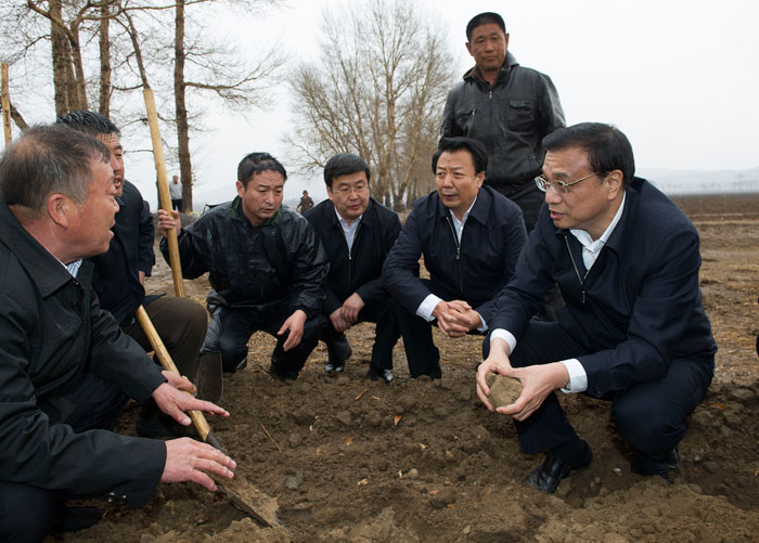 【李克強雨中翻地看墑情】28日下午,久旱的內(nèi)蒙古赤峰喀喇沁旗迎來今年第一場春雨。牽掛著春耕時節(jié)墑情的李克強總理在小雨中踩著泥水來到田間察看,他抄起鐵鍬翻起泥土,蹲下抓起土塊仔細察看。見到只有表層土被雨水浸透,深層還是干的,李克強說,這也只有“十個水”吧,再能下一天一夜就好了。