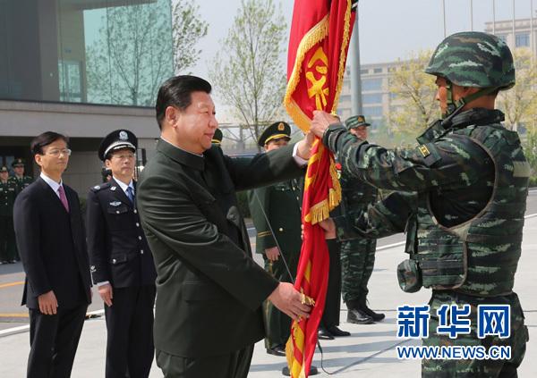4月9日,中共中央總書(shū)記、國(guó)家主席、中央軍委主席習(xí)近平視察中國(guó)人民武裝警察部隊(duì)特種警察學(xué)院并為“獵鷹突擊隊(duì)”授旗。這是習(xí)近平將隊(duì)旗鄭重授予“獵鷹突擊隊(duì)”大隊(duì)長(zhǎng)。新華社記者 李剛 攝