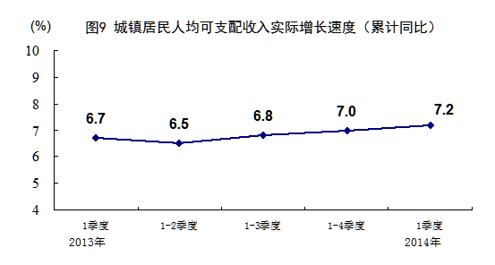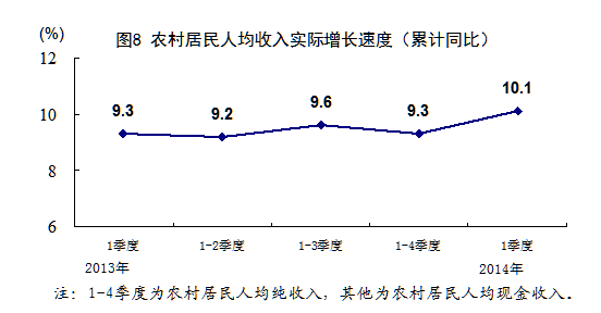 一季度,全國農村居民人均現(xiàn)金收入3224元,同比名義增長12.3%,扣除價格因素實際增長10.1%。全國城鎮(zhèn)居民人均可支配收入8155元,同比名義增長9.8%,扣除價格因素實際增長7.2%。根據(jù)從2012年四季度起實施的城鄉(xiāng)一體化住戶調查,2014年一季度全國居民人均可支配收入5562元,同比名義增長11.1%,扣除價格因素實際增長8.6%。全國居民人均可支配收入中位數(shù)4694元,同比名義增長14.0%。一季度末,農村外出務工勞動力16933萬人,同比增加288萬人,增長1.7%。外出務工勞動力月均收入2681元,增長10.1%。