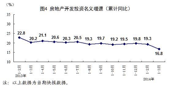一季度,全國房地產開發(fā)投資15339億元,同比名義增長16.8%(扣除價格因素實際增長15.5%),其中住宅投資增長16.8%。房屋新開工面積29090萬平方米,同比下降25.2%,其中住宅新開工面積下降27.2%。全國商品房銷售面積20111萬平方米,同比下降3.8%,其中住宅銷售面積下降5.7%。全國商品房銷售額13263億元,同比下降5.2%,其中住宅銷售額下降7.7%。房地產開發(fā)企業(yè)土地購置面積5990萬平方米,同比下降2.3%。3月末,全國商品房待售面積52163萬平方米,同比增長22.9%。一季度,房地產開發(fā)企業(yè)到位資金28731億元,同比增長6.6%。