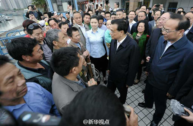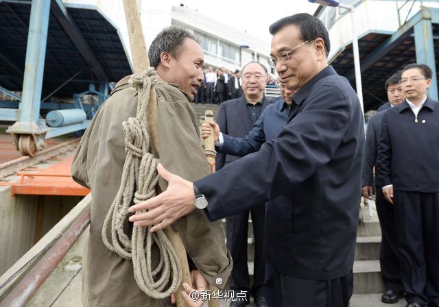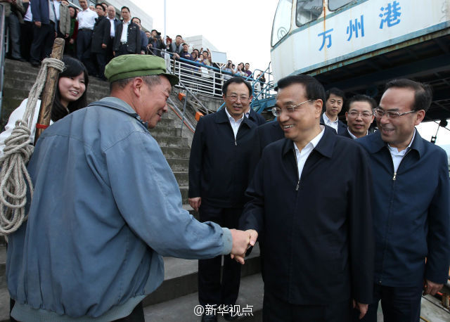 27日下午,在重慶萬州考察的李克強(qiáng)總理來到港口碼頭和群眾親切交流?吹60歲的“棒棒”何紹強(qiáng),李克強(qiáng)走過去接過他手中的扁擔(dān)說:“已經(jīng)磨得很潤滑,看來干這行有年頭了。”他還關(guān)切地?fù)嶂虾蔚难,問他腰背怎么樣?叮囑他干活時(shí)注意身體,千萬保護(hù)好腰。